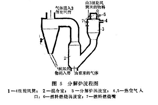 為了調整氣體動力學制度,分解爐內設有節(jié)流閘板,它位于混合室的圓錐形異徑管下部。分解爐工作的特性為:它完全依賴于回轉窯的操作制度。分解過的生料粉進入渦流室同回轉窯出來的熱廢氣相混合,并依靠廢氣熱令生料粉達到85-90%的分解。從混合室出來的含生料粉的氣體進入第四級旋風筒,生料粉在該筒內與氣流分開,并沿傾斜溜管進入回轉窯內。