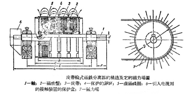 在皮帶輪式分離器內(nèi),沿著輪子的轉(zhuǎn)動其表面會產(chǎn)生強(qiáng)大的磁場,在較小直徑處的磁場達(dá)到750-900奧斯特,較大直徑處磁場達(dá)到1200-1400奧斯特,當(dāng)即將進(jìn)行球磨機(jī)粉碎的物料內(nèi)金屬塊落到這個磁場時,就會被吸進(jìn)并貼在筒上,然后脫落而被皮帶擲落到分離器下方的特殊卸斗內(nèi)。其具體結(jié)構(gòu)如圖: