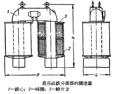 球磨機(jī)運(yùn)轉(zhuǎn)中所用的懸吊磁鐵分離器則主要由一些馬蹄形的鐵心構(gòu)成,其上繞有線圈,而下段裝有的端部。經(jīng)過此設(shè)備分離出來的金屬塊會在人工作用除去,具體結(jié)構(gòu)如下: